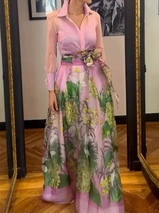 Holiday-style rayon printed lace-up long-sleeved shirt