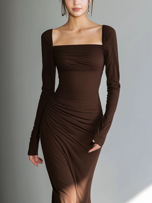 Dark Brown Square Neck Long-sleeved Pleated Fitted Maxi Dress
