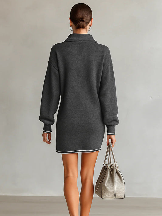 Fashion Loose Knit White Trim Zipper Polo Neck Mini Dress