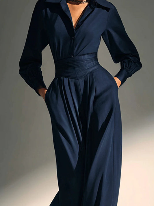 Navy Elegant Collared Wide-Leg Tailored Jumpsuit