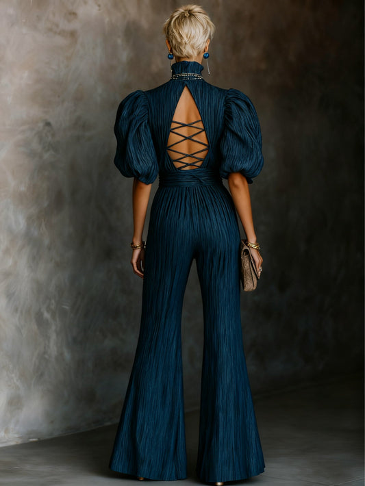 Dark Blue Textured Pleated High-neck Cross-strap Backless Jumpsuit