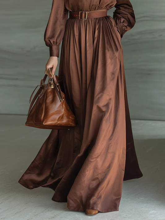 Caramel-colored Bow-tie Blouse and Long Skirt Two-piece Sett(with belt)