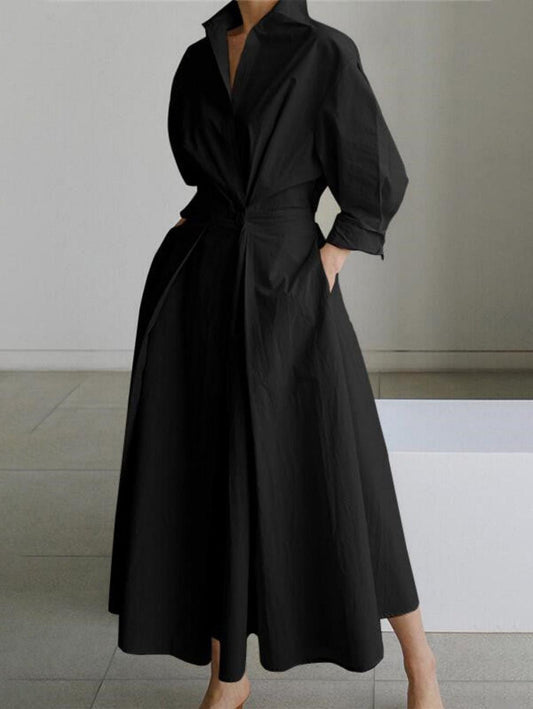 Elegant Pocket Button Lapel Collar Fold Solid Midi Dress