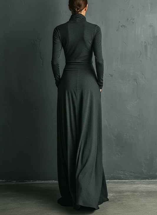 Elegant Stretch Polyester-Cotton Blend Turtleneck Draped Maxi Dress