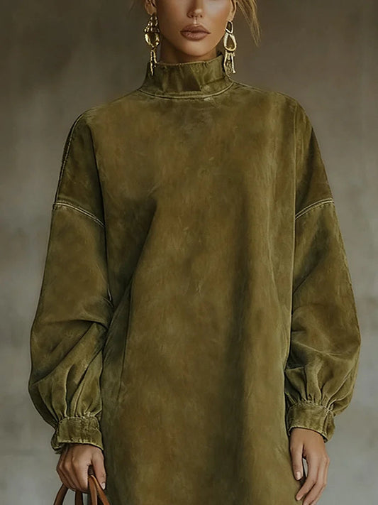 Green faux suede stand-up collar zipper tassel dress(Includes belt)